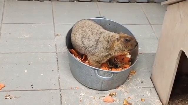 Байбак кушает тазиками в Карельском зоопарке