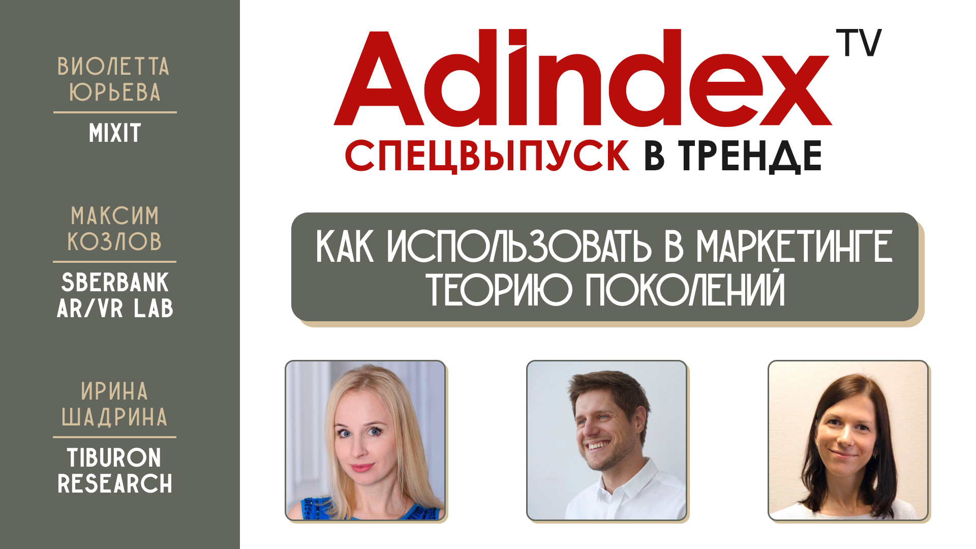 В новом выпуске «В тренде» Виолетта Юрьева, Mixit, Максим Козлов, Sberbank AR/VR lab и Ирина Шадрина, Tiburon Research, рассказывают: – Какие характерные черты отличают людей, за которыми наше будущее. – Как понимание особенностей поколения может помочь бизнесу в решении деловых задач. – Как маркетологам привлечь, а главное, удержать внимание молодежи. Обсудим влияние теории поколений на маркетинг в 12:30 Если вы хотите стать гостем нашей программы или предложить тему для выпуска, пишите в наш телеграм-бот: @AdIndex_news_bot Подписывайтесь на телеграм-канал для оперативных новостей https://t.me/adindex_live AdIndex во «ВКонтакте»: https://vk.com/adindex AdIndex в Одноклассниках: https://ok.ru/adindex.ru *В эфире могут упоминаться социальные сети Instagram и Facebook — организации признаны экстремистскими и запрещены на территории Российской Федерации