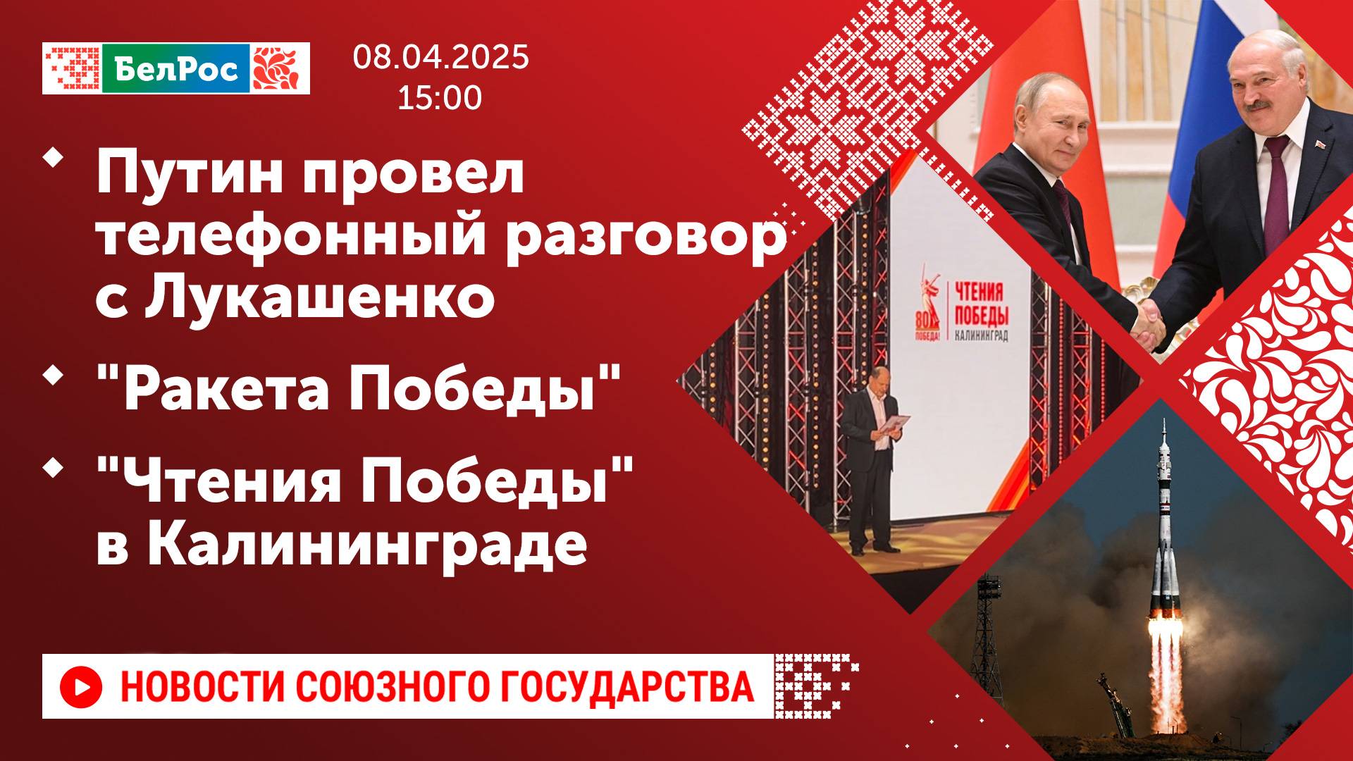 Закадровый текст озвучивает *ИИ Антон* Новости 08.04.2025 на 15:00 - Состоялся телефонный разговор Владимира Путина и Александра Лукашенко. - Спасатели МЧС России и Беларуси помогают жителям Мьянмы после землетрясения. - Беларусь и Пензенская область расширяют сотрудничество. - "Ракета Победы" с пилотируемым кораблём "Союз МС-27" стартовала с космодрома Байконур. - "Чтения Победы" прошли в Калининграде в юбилей освобождения города. - Бесплатный медосмотр смогли пройти жители Минска. - Художник из Пакистана провёл перформанс на трехметровом холсте в Москве. Смотрите главные новости Союзного государства на телеканале БелРос. Ссылки на наши соц. сети Сайт: http://belros.tv/ Telegram: https://t.me/belrostv Одноклассники: https://ok.ru/group/55657426976918 ВКонтакте: https://vk.com/belrostv TikTok: https://www.tiktok.com/@belros_tv?_t=... RuTube: https://rutube.ru/channel/23501830/ Яндекс. Дзен: https://zen.yandex.ru/belrostvv Наши подкасты на Яндекс. Музыке: https://music.yandex.ru/album/25615251 #главныеновости #новостисегодня #СоюзноеГосударство
