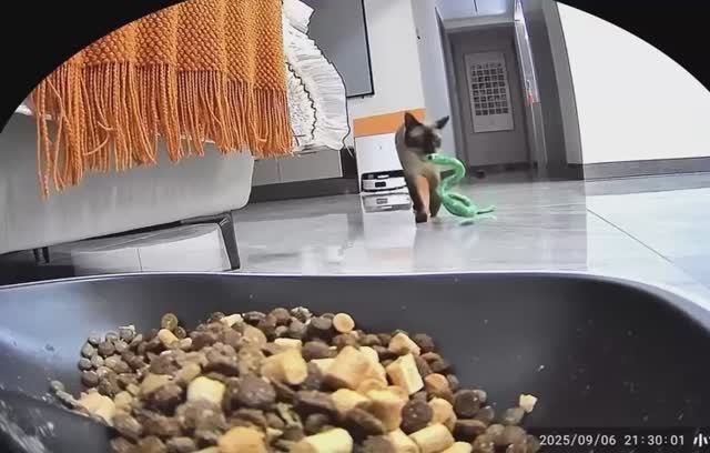 Кошка пытается накормить свою игрушку