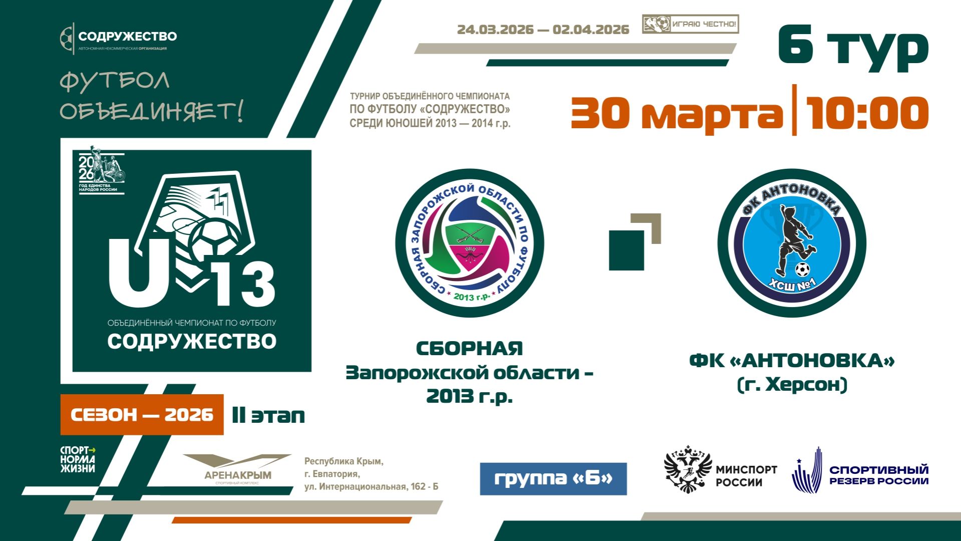6 ТУР [Группа Б] | Сборная Запорожской области 2013 г.р. - ФК «Антоновка» (г. Херсон) | 30.03.2026 | 10:00