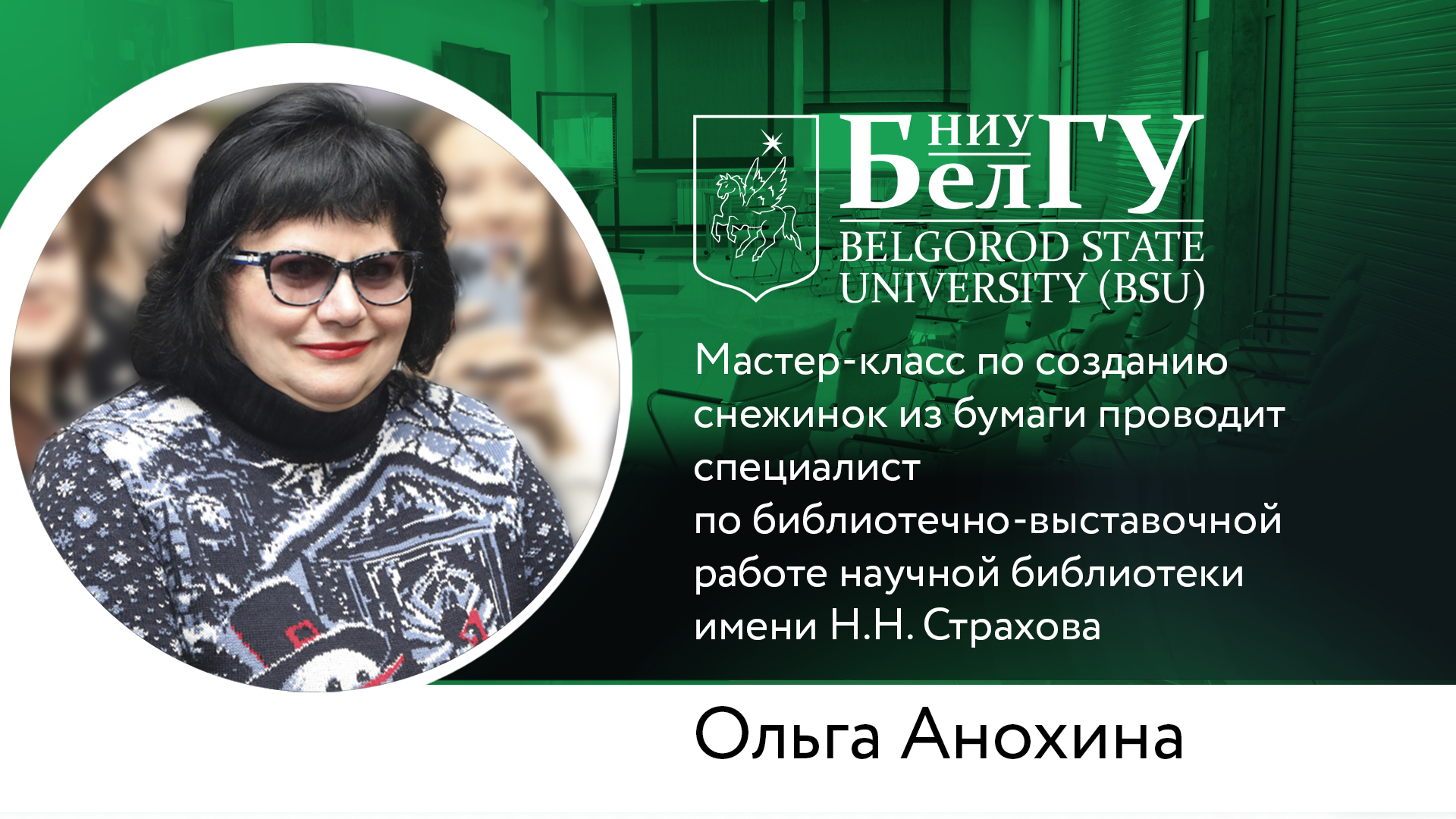 Специалист по библиотечно-выставочной работе университетской научной библиотеки им. Н.Н. Страхова Ольга Анохина – мастер на все руки. В её исполнении - мастер-класс по изготовлению изящных снежинок из бумаги. Как и в природе – не будет ни одной одинаковой!