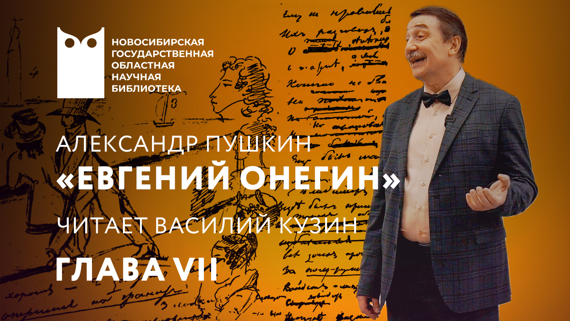 Профессор Новосибирского государственного театрального института (НГТИ) Василий Иванович Кузин читает роман в стихах Александра Сергеевича Пушкина «Евгений Онегин». Цикл литературных встреч приурочен к 225-летию Пушкина и проходит в рамках сотрудничества Новосибирской государственной областной научной библиотеки с театральным институтом. «Евгений Онегин» (1823—1830 гг.) — значительное произведение русской словесности, которое настолько объёмно и многогранно, что в разном возрасте и в разное время в нём можно найти новые смыслы, сделать удивительные открытия. Василий Кузин — один из самых активных и ярких пропагандистов художественного слова. У него есть одна удивительная особенность: произносит ли он речь для большой незнакомой аудитории, или для знакомой, студенческой, небольшой камерной, — Василий Иванович обращается к слушателям как к старым добрым друзьям. Проект будет интересен школьникам, студентам, преподавателям, всем любителям русской литературы и художественного слова. 24 апреля 2024 г. #ngonb #нгонб
