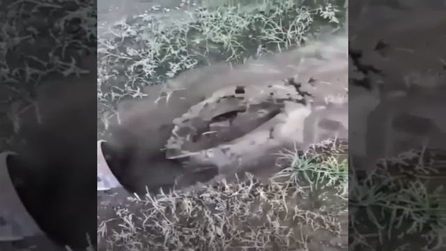 Вот так грамотно среагировал. Интересно, кто и как цепь там протащил в трубе, прежде чем покрышку привязать? Было бы потешно, если бы труба поехала следом.