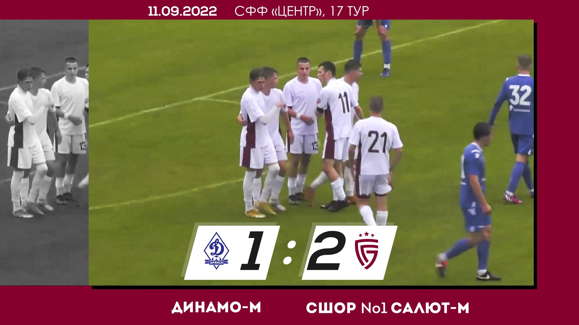 информация о матче: Дата: 11.09.2022 Cоперники: Динамо-М (Брянск) - СШОР №1 Салют-М (Белгород) Счет: 1:2 Голы: Данил Аносов (30' СШОР №1 Салют-М (Белгород)) Владислав Букатов (45' СШОР №1 Салют-М (Белгород)) Иван.А. Новиков (63' Динамо-М (Брянск))