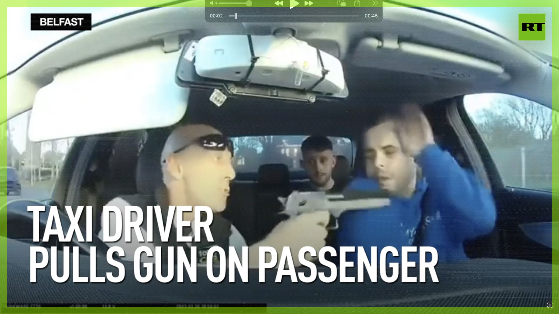 A cab driver from Northern Ireland has been arrested after pulling a gun on a passenger and threatening to blow his kneecaps off, and then pistol-whipping him. The 48-year-old taxi driver has since been arrested, for possession of, and intimidation with, a firearm. It has not been confirmed if the gun was real or fake, nor the reason behind the incident, although rumors circulating online indicate it was over a drug-related debt. The whole incident was captured on dashcam, which somehow ended up being posted online, to the incredulity of all. The driver’s employers, Fonacab, released a statement saying that the driver had been fired before the footage was leaked online. They also added ‘we average 100,000 bookings per week, and we do everything we can to ensure that each of those customers is given the same high level of professional service.’ ------------------------------------------------------------------------------------------- Freedom over censorship, truth over narrative. Follow us on Facebook: https://www.facebook.com/RTnews Follow us on Telegram: https://t.me/rtnews Follow us on Twitter: https://twitter.com/RT_com