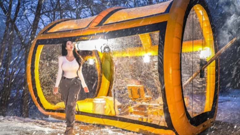 Снежный кемпинг в новой надувной палатке.