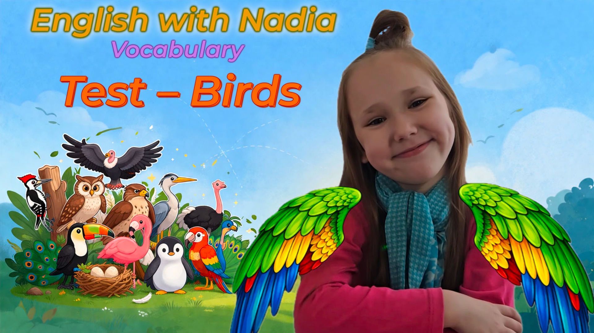 🧠 Лексический тест — Птицы | Учим английский с Надей! Время для весёлого словарного теста! В этом видео Надя проверяет, как хорошо вы знаете разных птиц. Смотрите внимательно и попробуйте назвать каждое слово до того, как оно появится на экране. Учить английский через животных и реальные примеры — это интересно и помогает легче запоминать новые слова! 👉 Постарайтесь ответить до озвучки! 👉 Досмотрите до конца, чтобы увидеть последний эпизод! 👧 Наде 6 лет, она любит учить английский через природу и игровые задания. 🧠 Лексика в этом тесте: ✔️ a woodpecker — дятел ✔️ a condor — кондор ✔️ an owl — сова ✔️ a hawk — ястреб ✔️ a heron — цапля ✔️ a nest — гнездо ✔️ a toucan — тукан ✔️ a flamingo — фламинго ✔️ a penguin — пингвин ✔️ a parrot — попугай ✔️ a peacock — павлин ✔️ an ostrich — страус 📚 Отлично подойдёт для детей, изучающих английский, и семей, которым нравится учить язык через животных и игры. Lights by Sakura Girl | https://soundcloud.com/sakuragirl_official Music promoted by https://www.chosic.com/free-music/all/ Creative Commons CC BY 3.0 https://creativecommons.org/licenses/by/3.0/