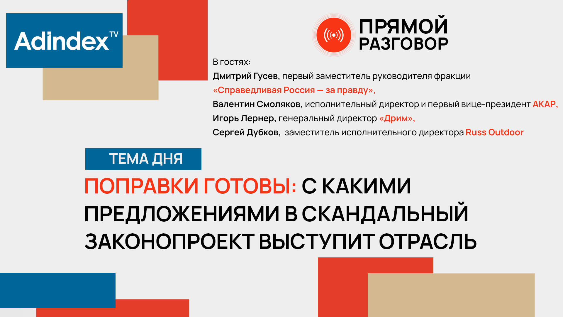 За последний месяц в сегменте наружной рекламы происходят нешуточные дебаты: игроки рынка, при поддержке органов власти, от регионального до федерального уровня, представителей депутатского корпуса выступают против принятия законопроекта №160605-8 "О внесении изменений в Федеральный закон "О рекламе". Сегодня рынок уже добился изменения сроков представления поправок в проект. Какие предложения уже сформированы, с чем готовы мириться операторы и что предпримут в случае принятия законопроекта в нынешней редакции — обсудим с экспертами в новом выпуске «Прямой разговор.OOH» Гости эфира: - Дмитрий Гусев, первый заместитель руководителя фракции «Справедливая Россия — за правду» - Валентин Смоляков, первый вице-президент АКАР - Игорь Лернер, генеральный директор «Дрим» - Сергей Дубков, заместитель исполняющего директора Russ Outdoor. «Прямой разговор» выходит в прямом эфире каждую среду и пятницу в 12:00. Если вы хотите стать гостем нашей программы, предложить тему для выпуска или задать вопрос гостям, пишите в наш телеграм-бот: @AdIndex_news_bot Подписывайтесь на телеграм-канал для оперативных новостей https://t.me/adindex_live Adindex во «ВКонтакте»: https://vk.com/adindex Adindex в Одноклассниках: https://ok.ru/adindex.ru *В эфире могут упоминаться социальные сети Instagram и Facebook — организации признаны экстремистскими и запрещены на территории Российской Федерации.