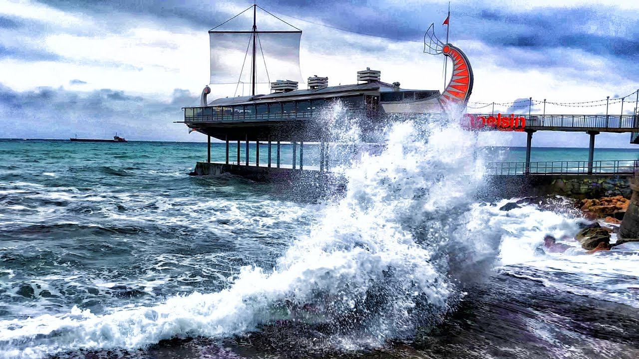 Шторм в Крыму на набережной ялты. Большие волны достают до набережной. Парень стоял слишком близко.