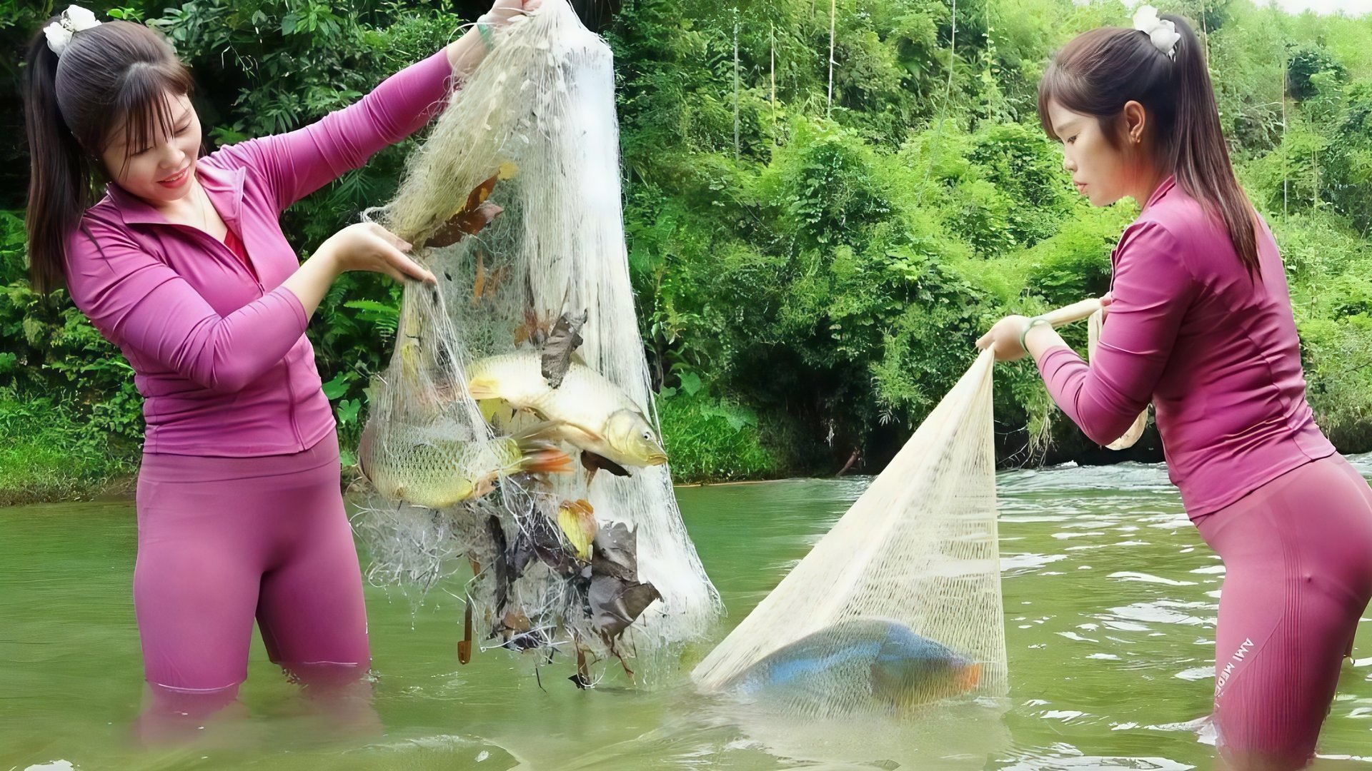 Юная рыбачка, поймала много рыбы сетью.