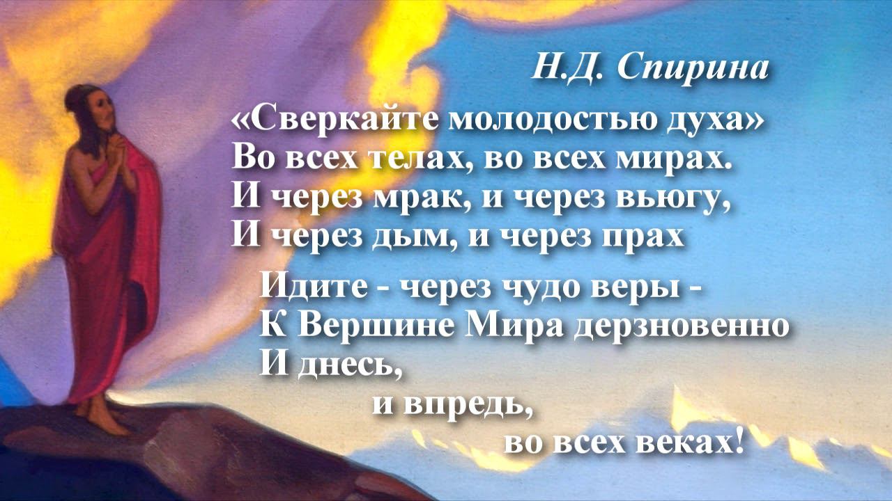 Наталия Спирина * * * Листы Сада М. Озарение, 1–XI–9 «Сверкайте молодостью духа» Во всех телах, во всех мирах. И через мрак, и через вьюгу, И через дым, и через прах Идите — через чудо веры — К Вершине Мира дерзновенно И днесь, и впредь, во всех веках! 1990-е гг. Читает автор. • Рериховская поэзия на сайте СибРО: http://sibro.ru/poetry/ #НаталияСпирина, #поэзияновойэпохи, #ПоэзияСпириной -------------------------------------------- О Наталии Дмитриевне Спириной: * Сайт, посвященный Н.Д. Спириной: https://spirina.info * Раздел на сайте СибРО: http://sibro.ru/teacher/spirina/ * Читать стихи: https://sibro.ru/poetry/ * Плейлист "Наталия Спирина. Стихи": https://www.youtube.com/playlist?list=PLRDwJtqWLAx6FDWLWUSyVeqmBAs0Cfx7c * Видеофильмы о Н.Д. Спириной: https://www.youtube.com/playlist?list=PLRDwJtqWLAx7zdjQRW1u5QSUW3T6SJ4rj * Вконтакте: https://vk.com/natalia.spirina * Telegram: https://t.me/SpirinaN • Рериховская поэзия: https://www.youtube.com/playlist?list=PLRDwJtqWLAx6Q4cJ_smGoz7zmaKXZee-N • Рериховская поэзия на сайте СибРО: http://sibro.ru/poetry/ -------------------------------------------- Помочь проектам СибРО: https://sibro.ru/dari-dobro/ Благодарим всех наших помощников и приглашаем к сотрудничеству! -------------------------------------------- /// Ссылки на ресурсы СибРО: Канал Сибирского Рериховского Общества и Музея Николая Рериха в Новосибирске https://www.youtube.com/c/videosibro Канал «Трансляции СибРО» https://www.youtube.com/c/telesibro ВКонтакте: «СибРО. Трансляции»: https://vk.com/telesibro Сайт СибРО: https://sibro.ru Сайт наследия Н.Д.Спириной: https://spirina.info Вконтакте: https://vk.com/roerichmuseumnsk Однокласники: https://ok.ru/roerichmuseum Telegram: https://t.me/RoerichN Дзен: https://dzen.ru/roerichmuseum Rutube: https://rutube.ru/channel/24606905/ Интернет-магазин "Искры Света": https://knigisibro.ru или на Ozon: https://www.ozon.ru/publisher/rossaziya-5101720/ Книги издательства СибРО "РОССАЗИЯ": https://rossasia.sibro.ru/knigi/