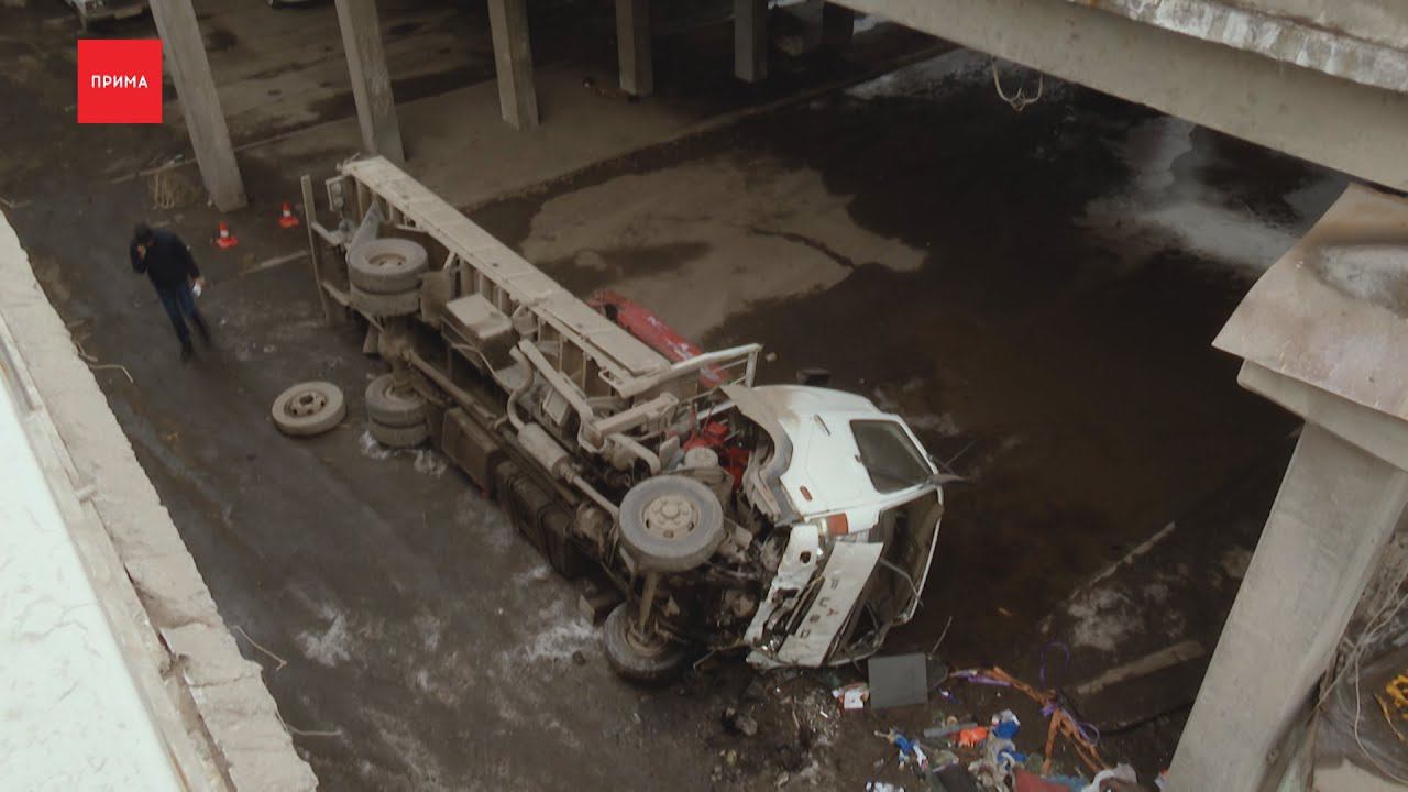Грузовик упал с Копыловского моста. Машина снесла ограждение и рухнула с 15-метровой высоты кабиной вниз. Водителя на скорой увезли в больницу. В ГИБДД, предварительно, считают, что мужчина не справился с управлением. Но на такой разбитой дороге это действительно не просто. На месте ДТП работал Павел Горшанов.