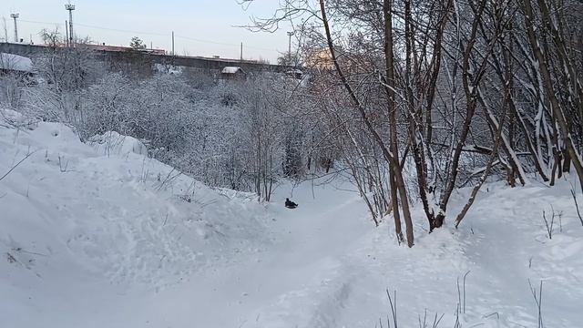 У моего дома огромная горка. Катаюсь с братом.