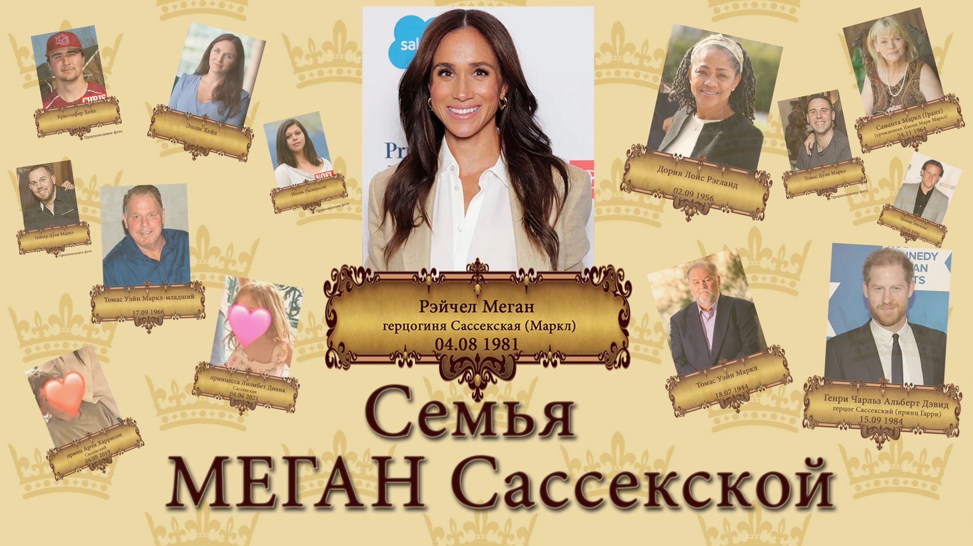 Приветствую! Меня зовут Лилит. Семья герцогини Сассекской Меган Маркл. Автор видео предупреждает, что все сказанное им в данном ролике является его личным мнением, его фантазиями, а также цитатами различных текстов из открытых источников в сети интернет. Автор не преследует цели оскорбить кого-либо и может ошибаться в своих выводах. Любое совпадение с реальными лицами является случайностью. Видео создано в развлекательных целях и не претендует на истину. Автор канала не являюсь профессиональным историком, астрологом, психологом, видеомонтажёром, актёром озвучки, и т.д. Автор предупреждает, что все сказанное им на данном канале является его личным мнением, его фантазиями, а также цитатами различных текстов из открытых источников в сети интернет. Автор не преследует цели оскорбить кого-либо и может ошибаться в своих выводах. Любое совпадение с реальными лицами является случайностью. Видео создано в развлекательных целях и не претендует на истину. Автор канала уважает все религии и чувства верующих и не пытается оспорить какое-либо религиозное течение.