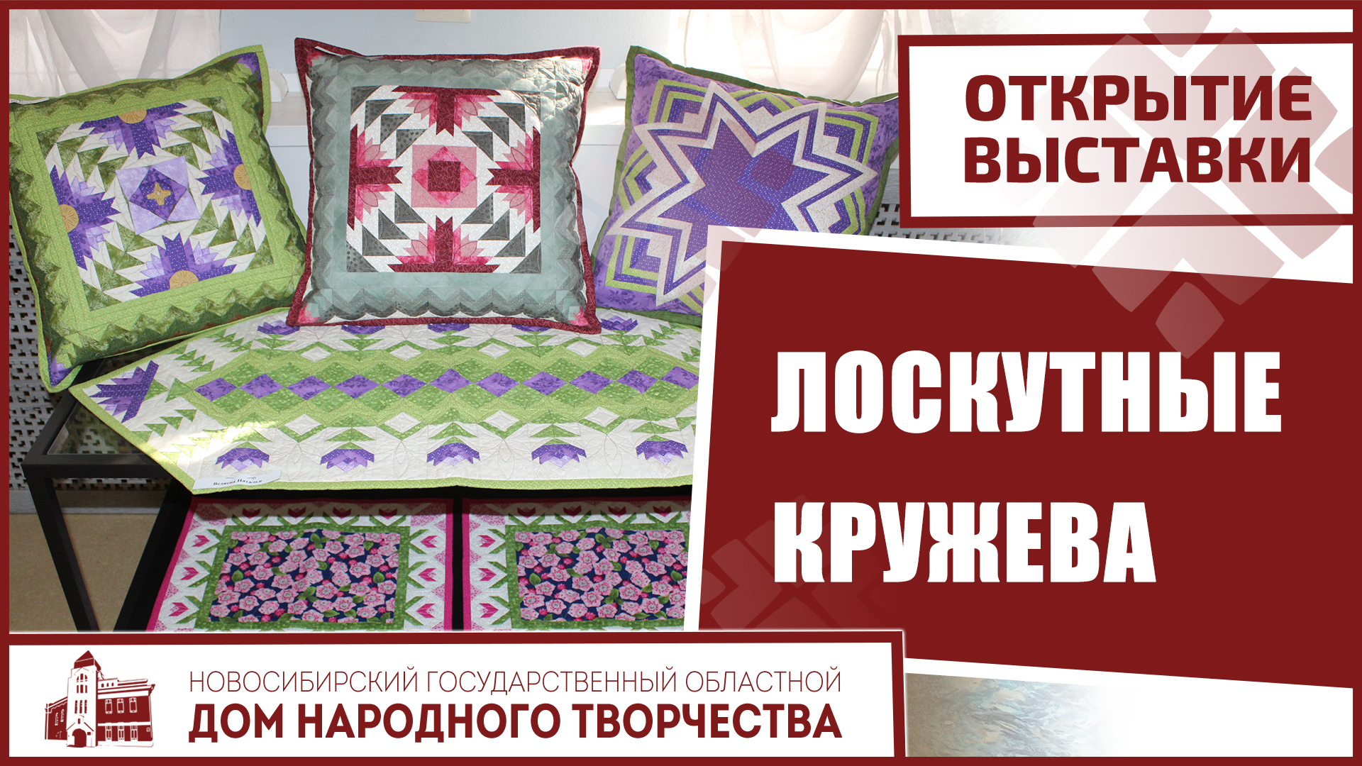 21 марта в Выставочном зале Новосибирского государственного областного Дома народного творчества состоялось открытие выставки «Лоскутные кружева», куда вошли, как коллективные, так и персональные работы мастериц-лоскутниц Творческой мастерской Натальи Муравьёвой. Посетители выставки могут увидеть как персональные работы руководителя мастерской, так и коллективные произведения её участниц: панно, игрушки, сумки, аксессуары.