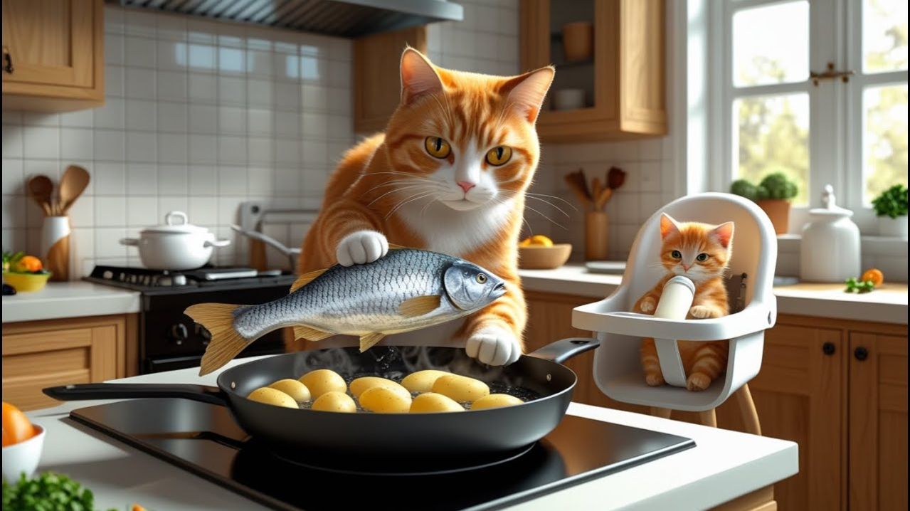 Хлопотный день мамы-кошки: От реки до кухни, всё ради улыбки её котёнка 🐟🍳🍼💤