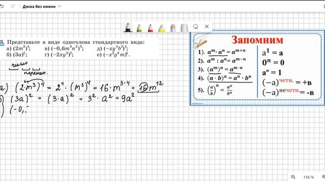 Алгебра 7 класс Тема "Возведение в степень произведения и степени. Одночлены" 00:00:00 № 449 00:05:40 № 473