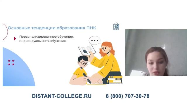 На вебинаре «Разрыв поколений: что ожидать будущему педагогу начальных классов при работе с детьми» спикер Старкова Татьяна Андреевна, преподаватель первой квалификационной категории, рассказала слушателям о системе персонализированного обучения в образовательных учреждениях. Татьяна Андреевна пояснила, в каких случаях необходим персонализированный подход в обучении. Она заметила, что персонализированные технологии обучения направлены на то, чтобы помочь каждому ребенку определиться с выбором будущей профессии. Педагог рассказала о формах персонализированного обучения с учетом способностей и склонностей учащегося, пожеланий родителей и самого ребенка. Спикер объяснила, что тенденции развития образования до 2030 года предполагают внедрение инструментов персонализированного обучения с дошкольного возраста. Татьяна Андреевна отметила, что организация персонализированного обучения — трудоемкий и длительный процесс, который требует тщательного изучения и исследования. Следите за нашими новостями в группах и на сайте, чтобы не пропустить новые интересные вебинары в 2022-2023 учебном году. ► Заходите на сайт distant-college.ru и выбирайте свою новую профессию! Действует акция: студенты колледжа обучаются второй квалификации бесплатно! Подписывайтесь на нас в соцсетях! ✔ Вконтакте - vk.com/distantcollege ✔ Telegram - t.me/nspk_college_group ✔ YouTube - www.youtube.com/channel/UCRDy