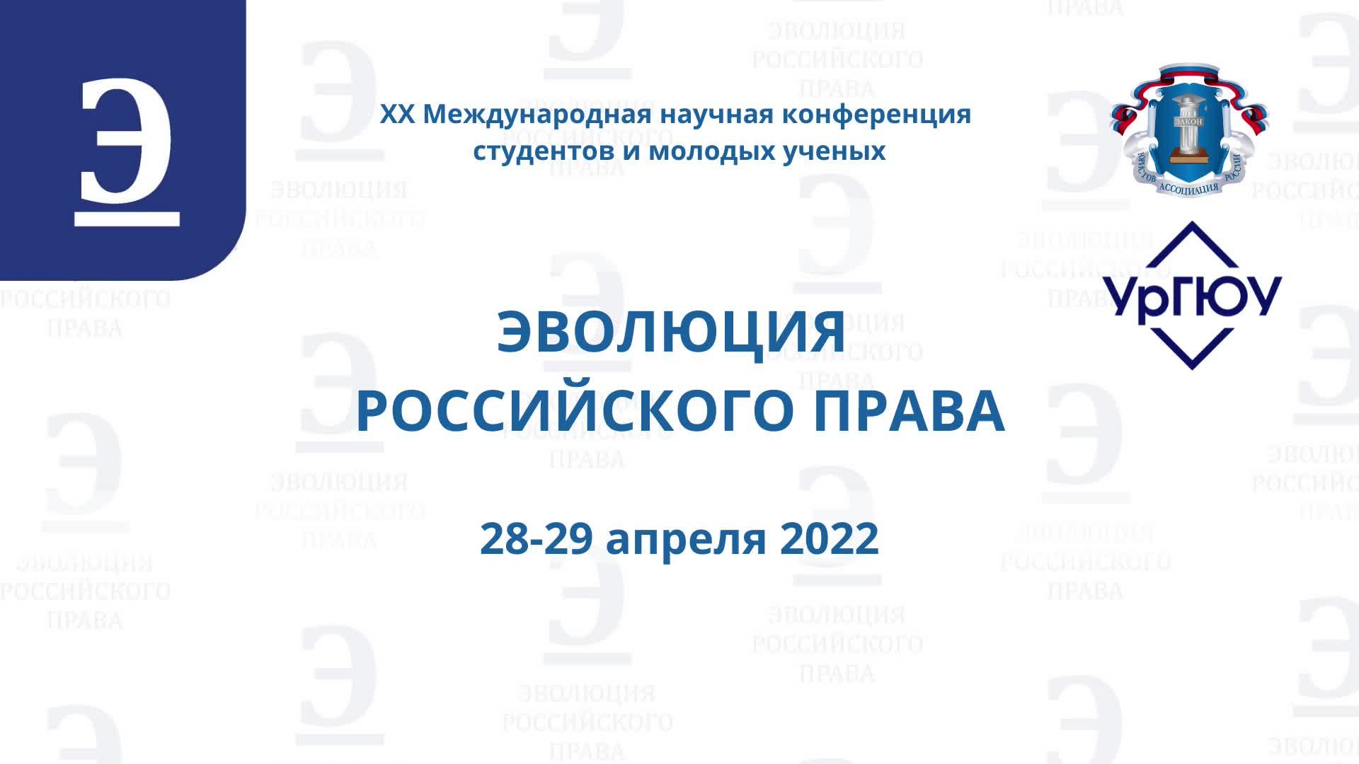 28–29 апреля 2022 г. в Уральском государственном юридическом университете имени В. Ф. Яковлева состоится XX Международная научная конференция студентов и молодых учёных «Эволюция российского права». Организаторами конференции выступают Свердловское региональное отделение общероссийской общественной организации «Ассоциация юристов России» и УрГЮУ имени В. Ф. Яковлева (Управление научных исследований, Совет молодых учёных, Студенческое научное общество). Цель конференции – анализ и обсуждение важнейших теоретических и практических проблем публичного и частного права. К участию в конференции приглашаются студенты, магистранты, аспиранты и молодые учёные не старше 30 лет.