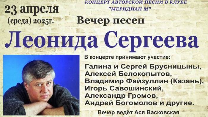 23 апреля в клубе бардовской песни «Меридиан М» состоялся вечер песен Леонида Сергеева — барда с широкой душой и неисчерпаемым талантом. Леонид Сергеев — глубокий философский автор с неиссякаемым запасом оптимизма, юмора и искрометной сатиры. Его главный талант — быть другом, быть Человеком. Многие счастливчики испытали этот талант на себе. В вечере принимали участие барды и авторы-исполнители: Алексей Белокопытов, Владимир Файзуллин (Казань), Игорь Савошинский, Александр Громов, Андрей Богомолов. Ведущая вечера Ася Васковская. Видеосъёмка Вадима Васковского. (резервная камера Zoom Q2n-4K)