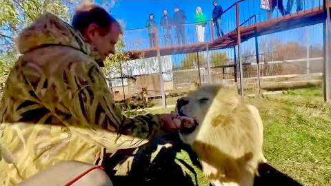 Это конечно ЖЕСТЬ белые львы стали настолько контактными что берут мясо прямо с рук!