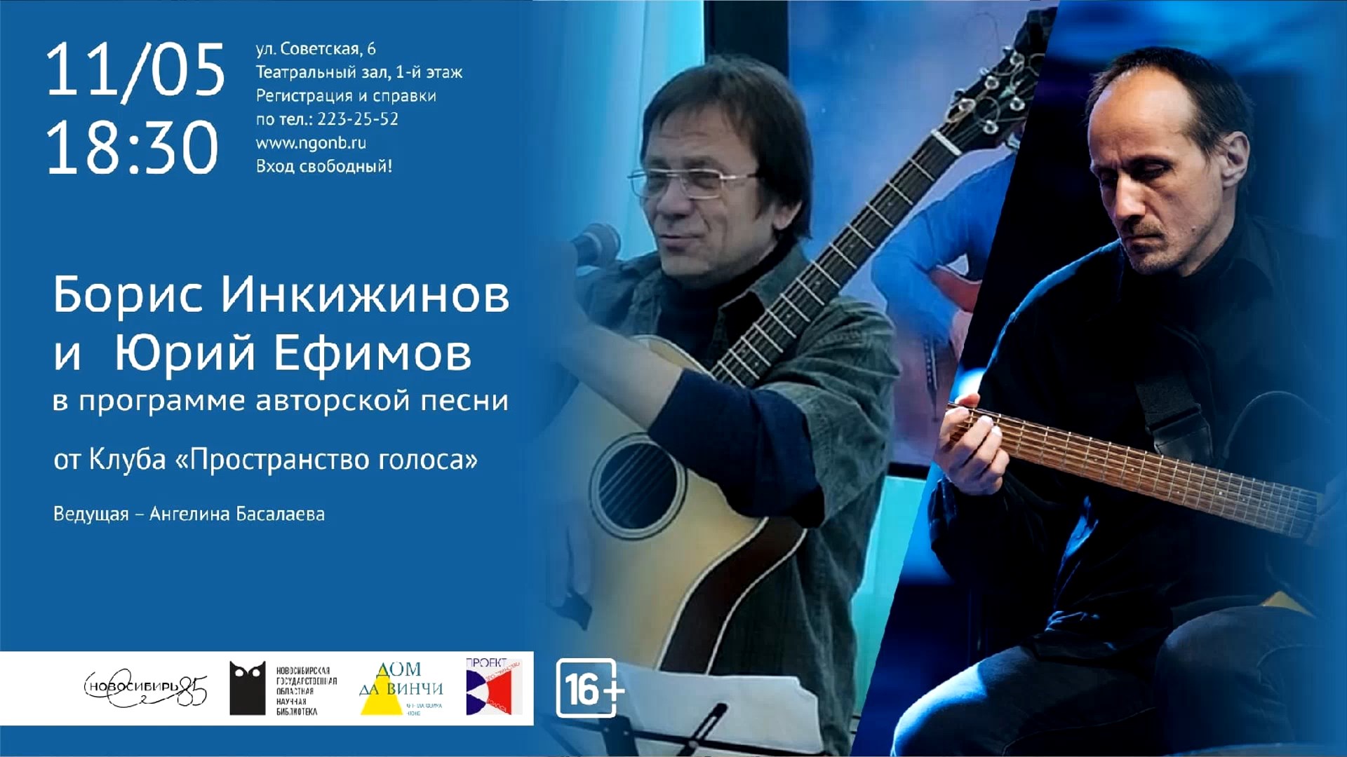 Борис Инкижинов и Юрий Ефимов в программе авторской песни от Клуба «Пространство голоса» Два ярких, при этом совершенно разных автора-исполнителя. Борис Инкижинов - прекрасный музыкант и автор-исполнитель со своим особым музыкальным подчерком. Борис известен как гитарист со своим узнаваемым музыкальным почерком. Лауреат фестивалей авторской песни. В этой программе Борис Инкижинов представит свои авторские песни. Юрий Ефимов исполнитель с актёрским багажом выразительный и яркий автор. Лауреат фестивалей авторской песни. Ждем вас на нашем вечере, обещаем он будет незабываемым! Ведущей вечера по традиции будет Ангелина Басалаева 11 мая 2022 года