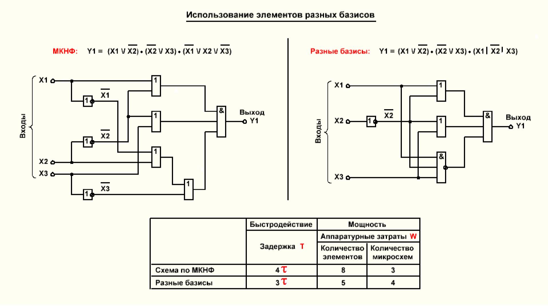 Рассматривается один из способов улучшения качества схем путем использования элементов разных базисов.