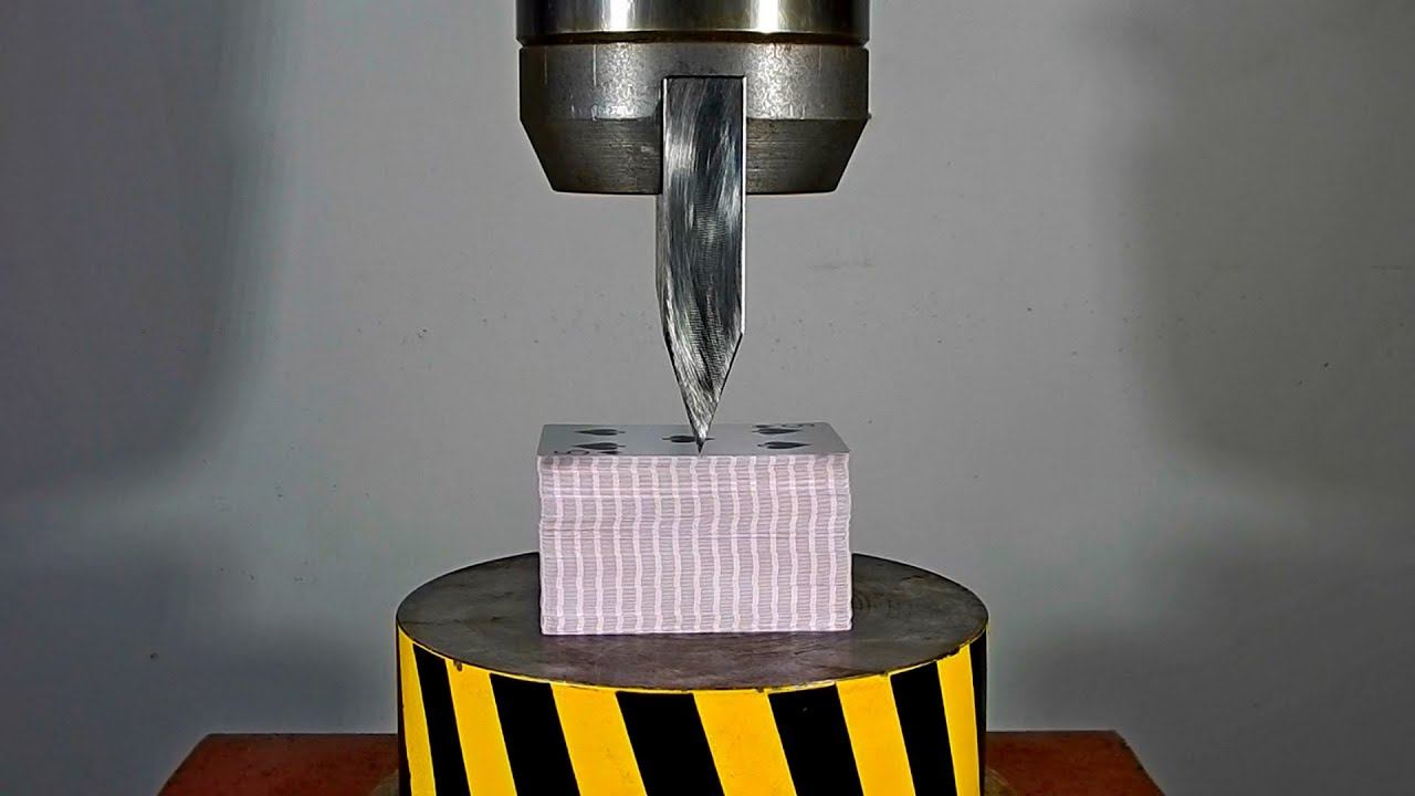 What happens if you put a deck of plastic cards under a 100-ton hydraulic knife