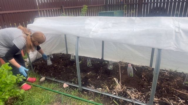 Огуречная грядка под агрощитом. 00:00 Высадка огурцов Автор высадила огурцы на грядку длиной 5 метров и шириной 90 см. Грядка была заказана в компании "Сибирский агроном" и оснащена укрывным материалом. Изначально планировалось высадить томаты, но эксперимент с огурцами в Ленинградской области оказался успешным. 00:49 Подготовка рассады Огурцы были в стаканчиках с обрезанным дном для вентиляции. Земля не прогрелась до нужной температуры, поэтому огурцы были посажены на холмике для полива. Грядка выглядит не очень красиво, но это допускается при органическом земледелии. 01:20 Плотность посадки В одном стаканчике взошли два огурца, поэтому посажены по два. Расстояние между огурцами составляет около 40 см. Автор забыла про морковь, которую посадила рядом, и теперь сожалеет об этом. 02:27 Планы на грядку Автор планирует уплотнить грядку зеленью, морковью или луком. Также рассматривает возможность посадки свеклы. Грядка закрыта укрывным материалом, чтобы защитить огурцы от ветра. 03:13 Заключение Автор надеется на успешный рост огурцов под укрывным материалом. Пожелание хорошего дня и хороших урожаев зрителям.