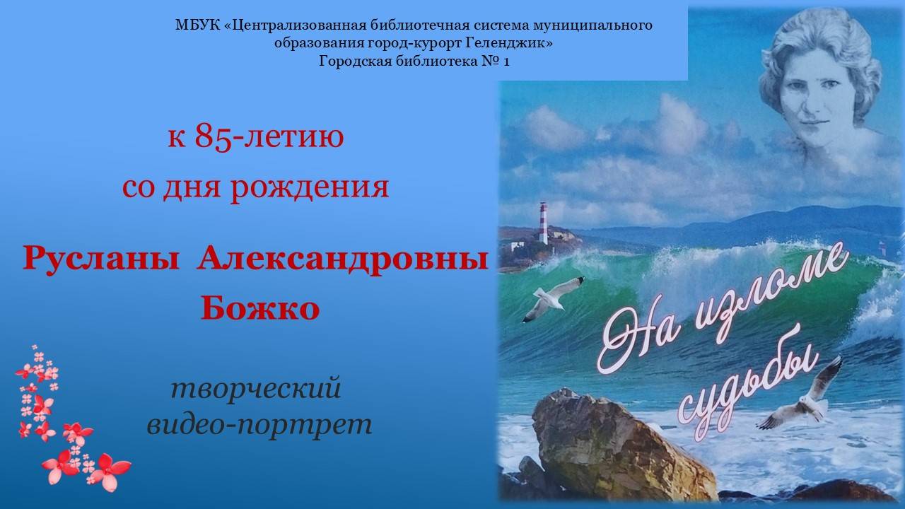 «Ничто не вечно, всё быстротечно, умчится молодость, останутся лишь добрые дела...» Р.А. Божко Городская библиотека №1 подготовила творческий видео-портрет, посвященный юбилейной дате – 85-летию заслуженного работника культуры Кубани Русланы Александровны Божко. Представленный видео-ролик в виде альбома памяти осветил самые значимые, яркие страницы жизни Русланы Александровны: детство, юность, студенчество, работа в Геленджике, активная общественная работа. Весь этот материал был подготовлен на основе очерка-исповеди, где искренне и откровенно Руслана Божко написала о себе, о своей не простой судьбе, которая в течении всей жизни пытала ее на излом. Ее книга наполнена воспоминаниями об интересных, талантливых людях, с которыми Руслане Александровне посчастливилось повстречаться на жизненном пути. Её творчество наполнено любовью и болью, её стихи восхищают и волнуют своей честностью, открытостью, в них море чувств и эмоций, восторга окружающей ее природе, любимом городе Геленджике. Пожелаем Руслане Александровне крепкого здоровья, больших творческих планов, вдохновения и встреч с интересными людьми. #ЧитающийГеленджик, #БиблиотекиГеленджика