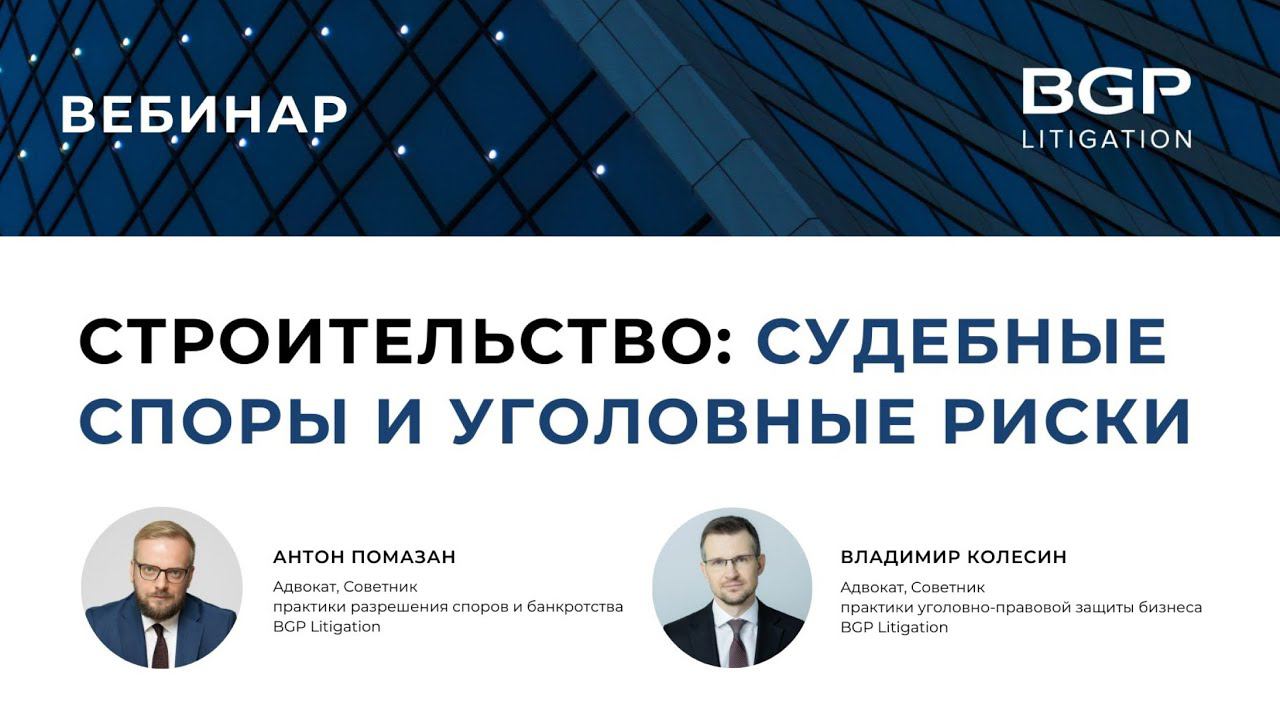 На вебинаре Антон Помазан, адвокат, советник практики разрешения споров и банкротства BGP Litigation, и Владимир Колесин, адвокат, советник практики уголовно-правовой защиты бизнеса BGP Litigation, разобрали вопросы: Оспаривание градостроительных документов: отказа в выдаче разрешения на строительство и разрешения на ввод объекта в эксплуатацию, результатов строительного надзора и др.; Приостановление работ и отказ от договора строительного подряда: спорные вопросы применения ст.ст. 716, 719 ГК РФ; Судебная строительно-техническая и оценочная экспертизы: тонкости правоприменительной практики; Действия, которые обычно приводят к уголовному преследованию; Способы предотвращения уголовных рисков. Присоединяйтесь к BGP Litigation в социальных сетях: ▪️Facebook https://www.facebook.com/bgplitigation ▪️Telegram https://bgplaw.com/telegram Связаться с нами: ▪️https://bgplaw.com ▪️office@bgplaw.com ▪️+7 (495) 777 28 20