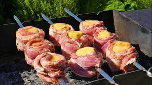 Шашлык 2 в 1, из картошки и свиной грудинки. С грибным соусом