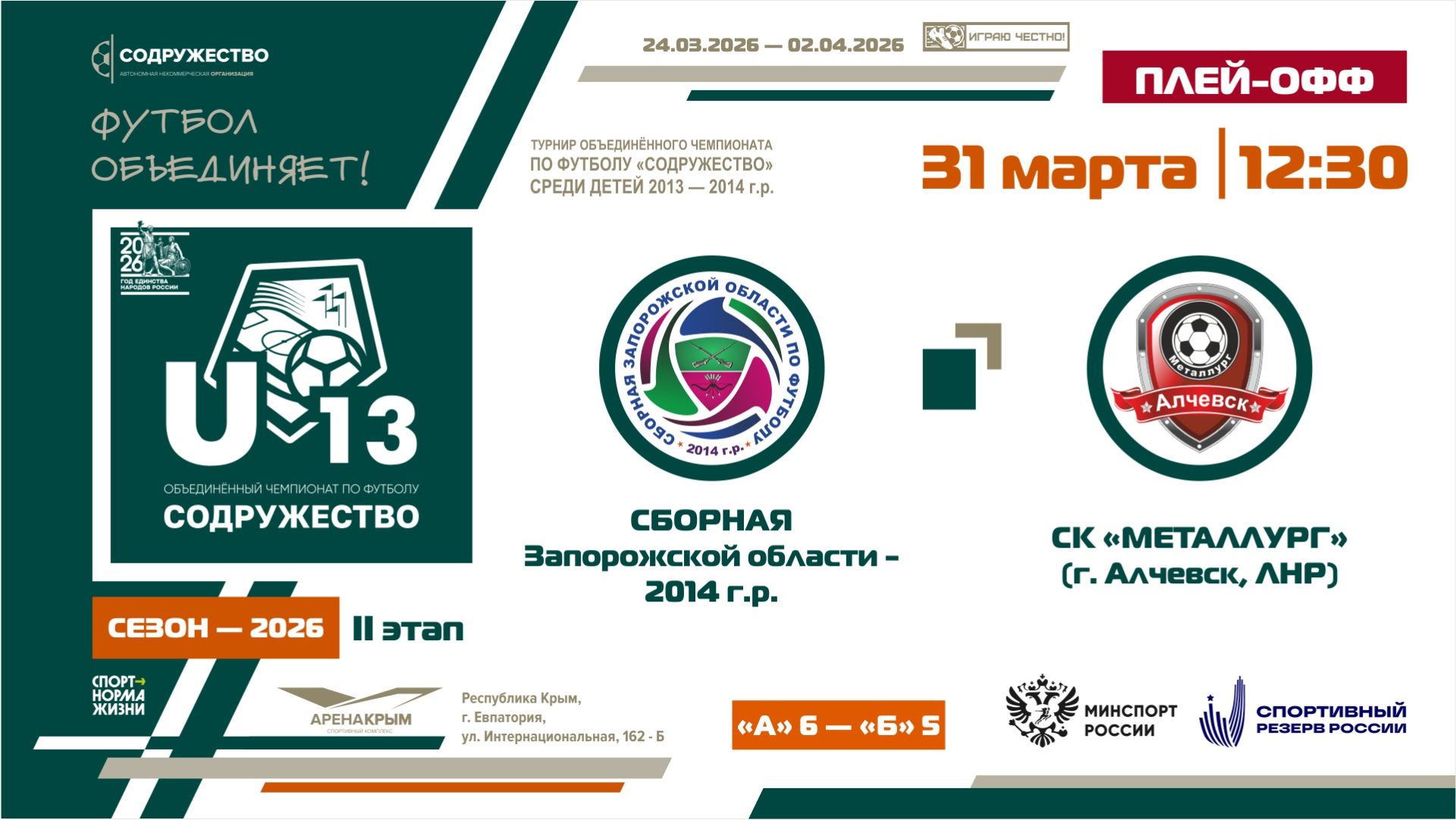 Плей-офф за 9-12 места | Сборная Запорожской области 2014 г.р. (А6) – (Б5) СК "Металлург" (г. Алчевск, ЛНР) | 31.03.2026 | 12:30
