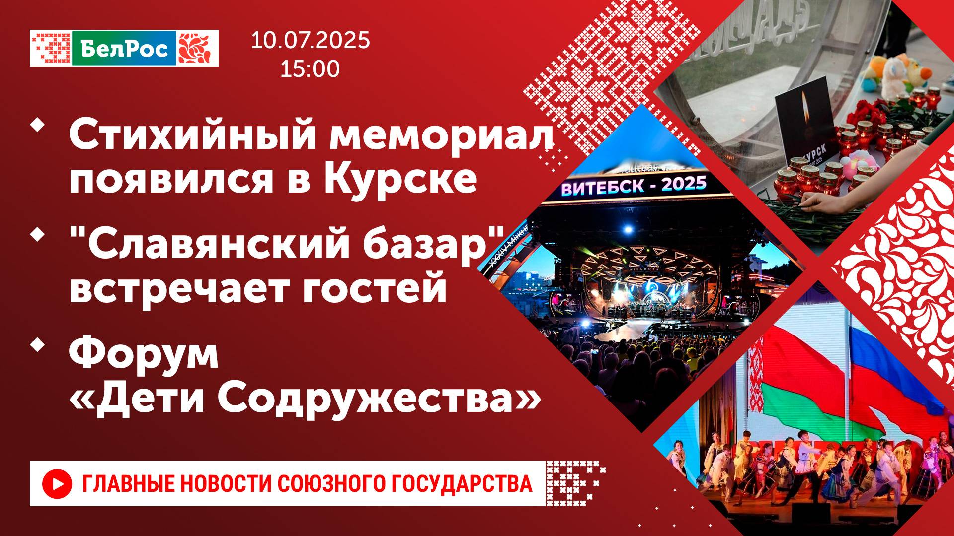 Закадровый текст озвучивает *ИИ Антон* Новости 10.07.2025 на 15:00 - Стихийный мемориал появился в Курске после удара ВСУ по пляжу. - В Мелитополе задержали двух агентов украинской военной разведки. - Военнослужащие смогут мгновенно подтверждать участие в СВО онлайн. - "Славянский базар" встречает гостей и участников. - Первый день X Международного форума прошёл в Зубрёнке. - В Минске открыли экологическую остановку. Смотрите главные новости Союзного государства на телеканале БелРос. Ссылки на наши соц. сети Сайт: http://belros.tv/ Telegram: https://t.me/belrostv Одноклассники: https://ok.ru/group/55657426976918 ВКонтакте: https://vk.com/belrostv TikTok: https://www.tiktok.com/@belros_tv?_t=... RuTube: https://rutube.ru/channel/23501830/ Яндекс. Дзен: https://zen.yandex.ru/belrostvv Наши подкасты на Яндекс. Музыке: https://music.yandex.ru/album/25615251 #главныеновости #новостисегодня #СоюзноеГосударство