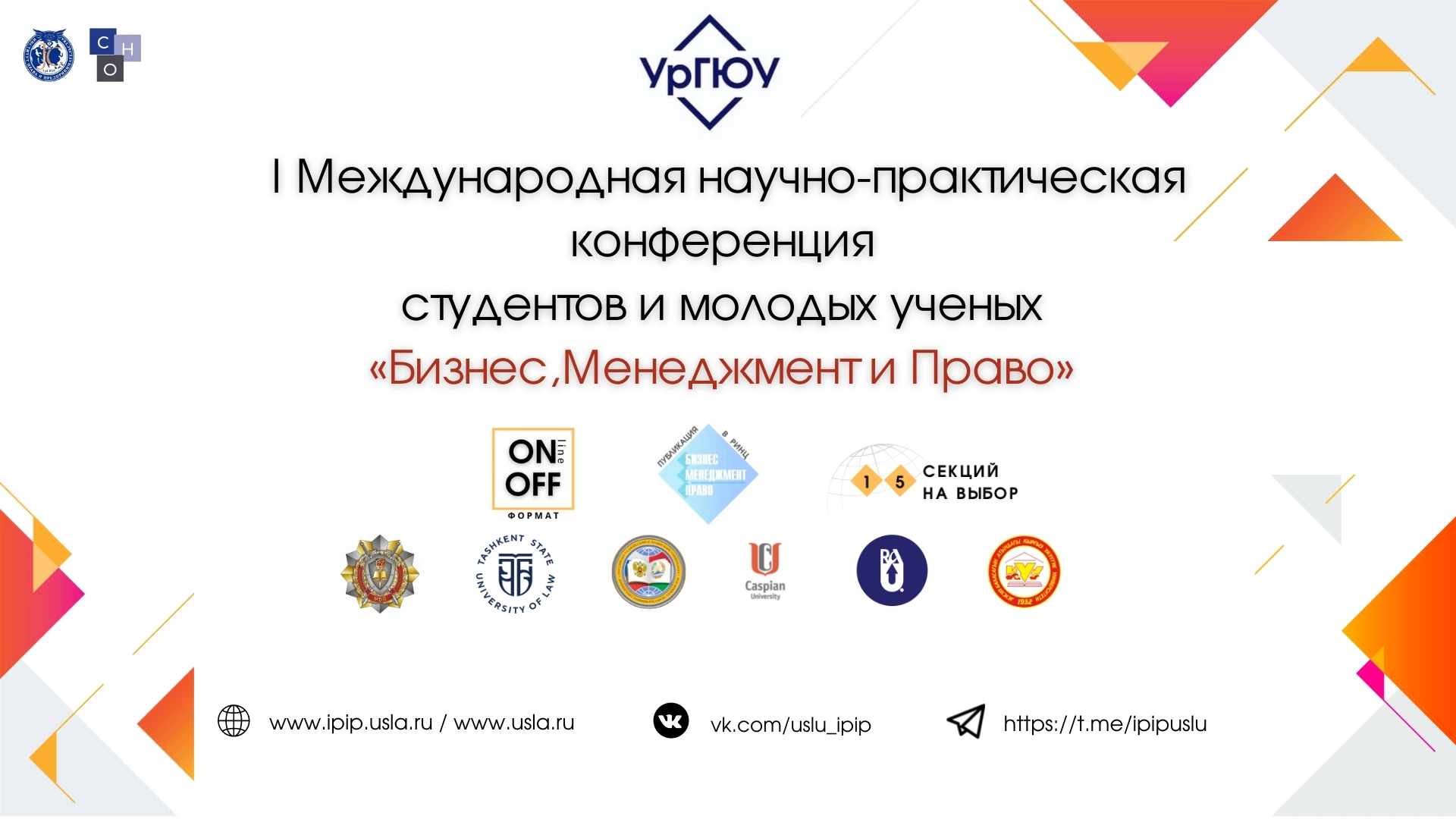 Конференция «Бизнес, Менеджмент и Право» - это площадка, где собрались молодые умы науки, практикующих юристы и бизнесмены; площадка, где участники из 7 страны готовы поделиться своим опытом и идеями для обсуждения наиболее актуальных вопросов правового и экономического характера. В настоящем году Конференция будет проходить сразу в двух форматах: on-line и off-line. В ее рамках будет организована работа 15 секции, одна из которых на английском языке По материалам Конференции будет издан сборник тезисов участников с последующим размещением в РИНЦ Конференция «Бизнес, Менеджмент и Право» - это Ваша возможность показать и осветить свои идеи в сфере права и экономики. Оказать влияние как на практическую, так и на теоретическую сторону правовой науки и не только. Не упустите возможность стать частью этого события!