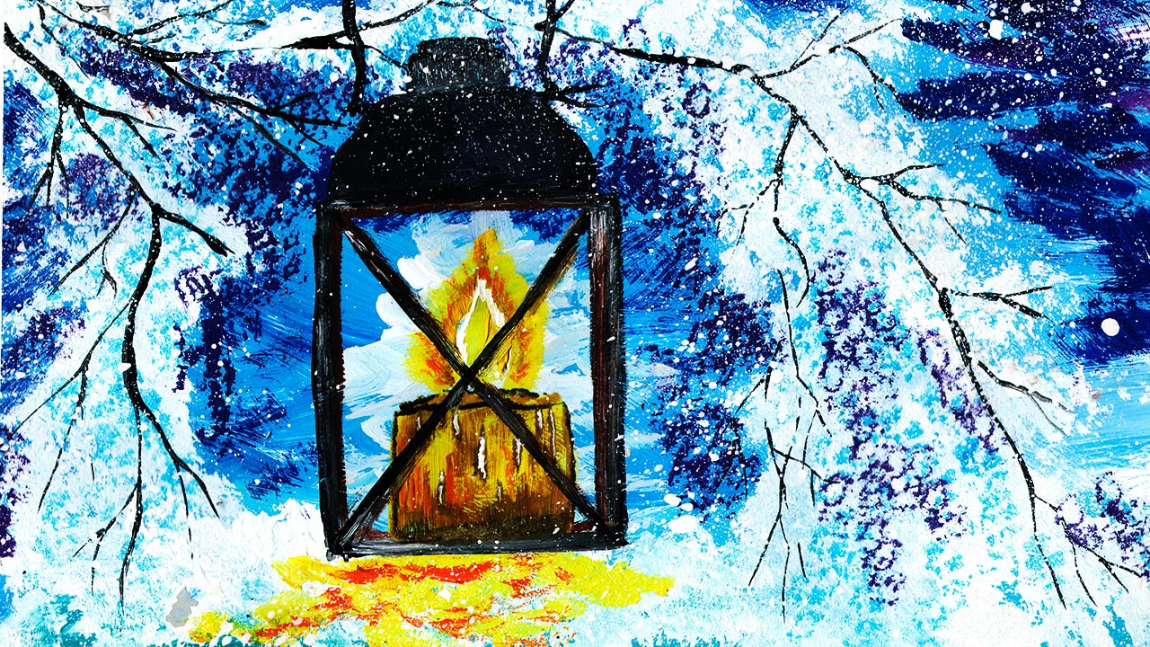 Рисуем зимнюю сказку. Рисуем новогоднее настроение. Зимний пейзаж красками. Рисуем свечу.