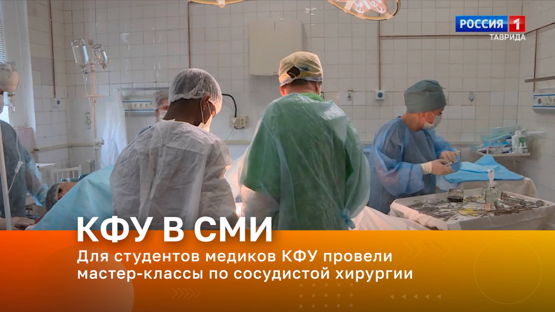 Телеканал «Россия 1. Таврида». В эфире – заведующая кафедрой хирургии №1 Медицинского института им. С.И. Георгиевского КФУ им. В.И. Вернадского Оксана Гербали Тема эфира – В клинической больнице Симферополя для студентов медиков КФУ провели мастер-классы по сосудистой хирургии.
