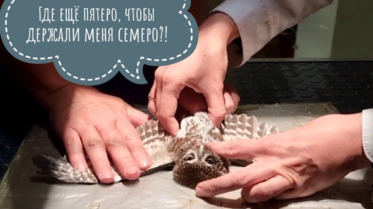 Совы Пуньк, Вжух и Кроша на осмотре у ветеринара Марии Маркиной. Сове точат жало и тыкают палочкой