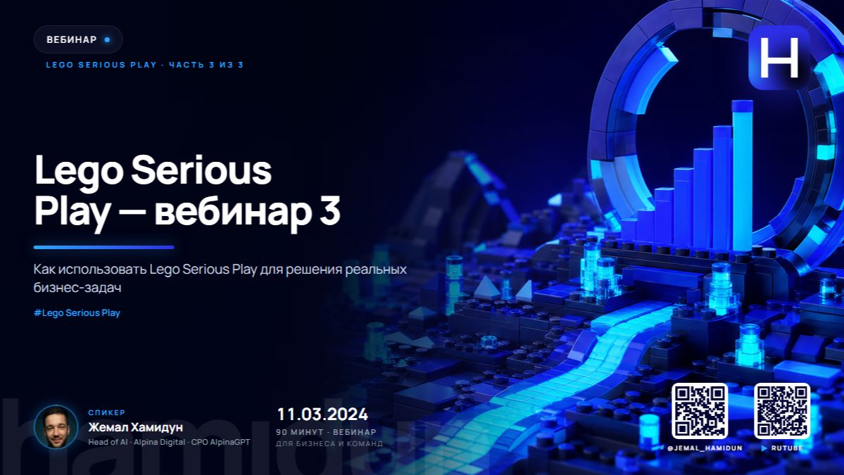Третий вебинар серии Lego Serious Play от 11 марта 2024: групповые модели, сценарное моделирование и использование LSP на стратегических сессиях. Сложные упражнения и разбор типичных ошибок фасилитатора. Спикер: Жемал Хамидун — Head of AI в Alpina Digital, CPO AlpinaGPT. Telegram: @jemal_hamidun Сайт: hamidun.com AlpinaGPT: my.alpinagpt.ai