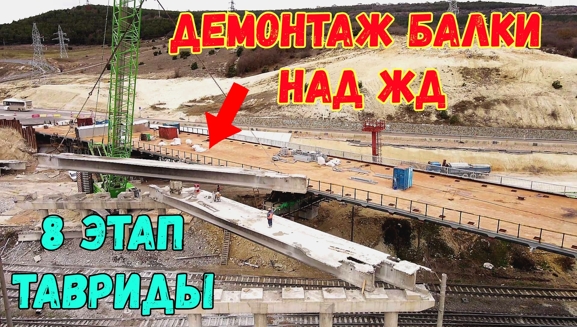 8 этап ТАВРИДЫ.Процесс ДЕМОНТАЖА пролётной балки СТАРОГО путепровода над железной дорогой.КРЫМ