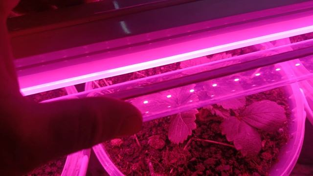 Клубника на поддоконике, под лампами