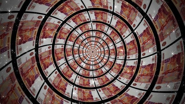 Рубль. Купюры в 5000 рублей, закрученные в спираль. Национальная валюта. Зацикленная абстракция в 4K