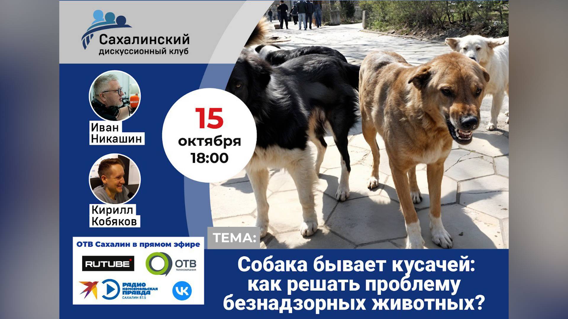 Сегодня, 15 октября, в 18.00 на RUTUBE-канале ОТВ-Сахалин (https://rutube.ru/channel/23456721) и на Радио КП-Сахалин (https://t.me/kpsakh) (87,5 ФМ, а также RUTUBE (https://rutube.ru/channel/24954560) и VK (https://vk.com/kpsakhalin)) в прямом эфире состоится очередное заседание Дискуссионного клуба. 🗣Тема выпуска: «Собака бывает кусачей: как решать проблему безнадзорных животных?» Наши эксперты: 🟢Михаил ЧЕРЕВИК, депутат Сахалинской областной думы; 🟢Ирина САВИЦКАЯ, депутат Сахалинской областной думы. 🎙 Ведущие: Кирилл КОБЯКОВ и Иван НИКАШИН ❗️Внимание! Принять участие в дискуссии может каждый, прислав сообщение на наш вотсап 📞 +7 914 741-59-09