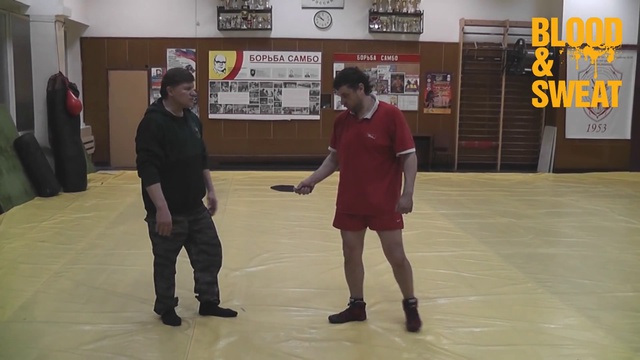 Заслуженный тренер России Валерий Валентинович Волостных демонстрирует для Blood&Sweat защиту от колющего удара ножом.