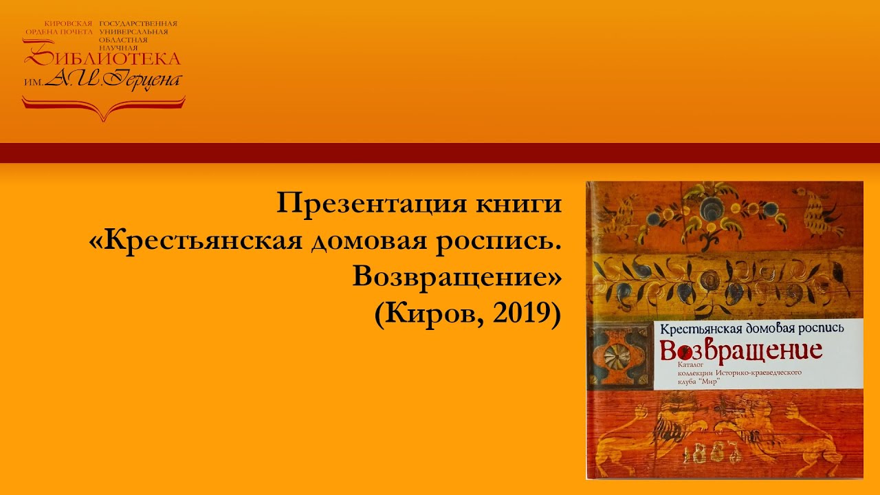Домовая крестьянская роспись – уникальный, но почти забытый сегодня вид русского народного искусства. Благодаря поддержке Фонда президентских грантов в 2019 году Центром русской культуры и письменности «Мир» был разработан и реализован проект по изучению и популяризации этого промысла. Итоговым событием воплощения проекта стал каталог «Крестьянская домовая роспись. Возвращение» (Вятка, 2019). Руководитель Историко-краеведческого клуба «Мир» Людмила Георгиевна Крылова познакомила зрителей с каталогом, в котором представлены 340 предметов крестьянской народной домовой росписи, собранные участниками Центра культуры и письменности «Мир» в результате 30-летней экспедиционной деятельности на Русском Севере. Также в презентации книги «Крестьянская домовая роспись. Возвращение» (Вятка, 2019) приняли участие кандидат исторических наук, доцент кафедры отечественной истории ВятГУ Елена Витальевна Кустова и руководитель научно-исследовательского Центра регионоведения Кировской областной научной библиотеки им. А. И. Герцена, доктор исторических наук, профессор Михаил Сергеевич Судовиков. Сайт библиотеки им. А. И. Герцена – http://herzenlib.ru/