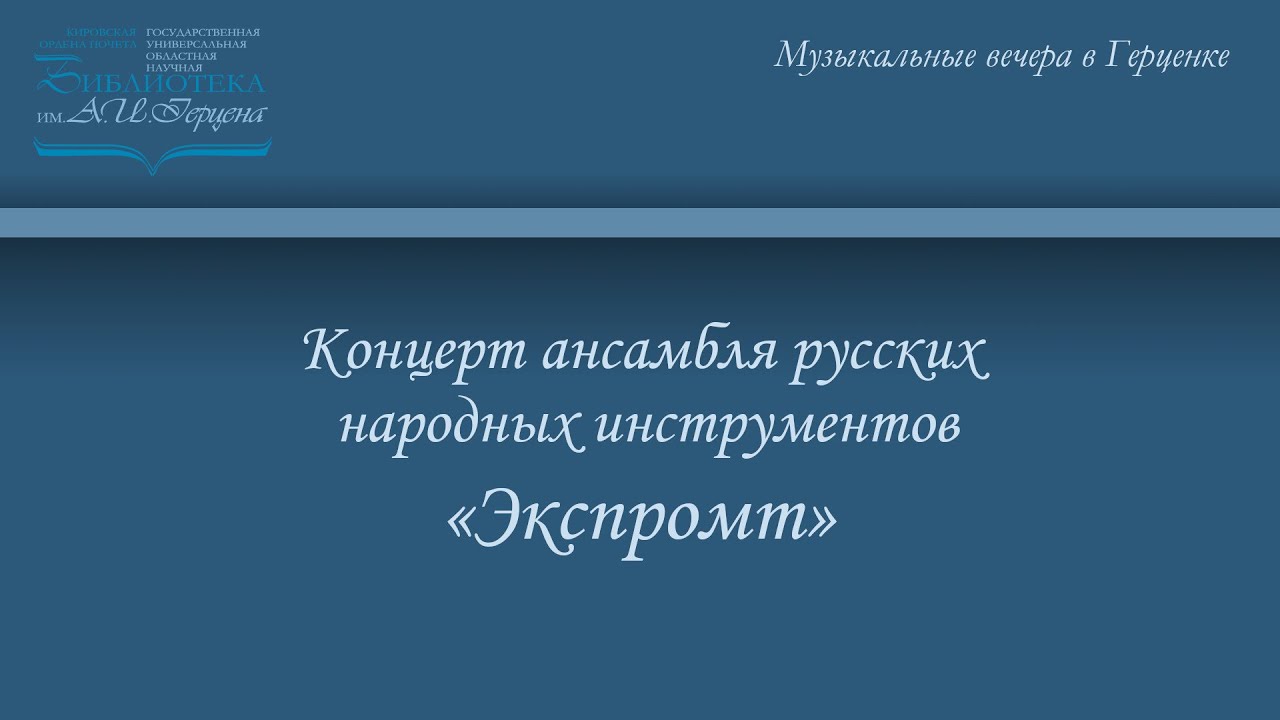 В Герценовском зале в рамках проекта «Музыкальные вечера в Герценке» состоялся концерт лауреата всероссийских и международных конкурсов ансамбля русских народных инструментов «Экспромт» Кировского колледжа музыкального искусства им. И. В. Казенина. Творческий коллектив состоит из студентов отделения «Инструменты народного оркестра» Кировского колледжа музыкального искусства им. И. В. Казенина. Помимо студентов колледжа участниками ансамбля являются и бывшие выпускники учебного заведения (сегодня уже выпускники консерваторий Москвы, Санкт-Петербурга, Нижнего Новгорода). В новом составе музыкального коллектива: Ирина Ворончихина (малая домра), Евгений Ерёмин (малая домра), Варвара Малых (домра), Александр Ерёмин (баян), Валерий Ворожцов (балалайка-контрабас), Анастасия Шафикова (домра). Руководитель – Татьяна Николаева. Программа концерта. А. Цыганков «Экспромт» (солист Е. Ерёмин); Е. Дербенко «Фестиваль», «Гармонист играет твист», «Ковбой»; В. Трофимов «Утушка в Латинской Америке»; Русская народная песня «Ох, балалайка» (солистка Василиса Печёнкина); А. Цыганкоа «Тустеп» (солистка Анастасия Шафикова); А. Цыганков «Перевоз Дуня держала» (солист Евгений Ерёмин); А. Цыганков «Мардяндя» (солистка Ирина Ворончихина); Собачий вальс из репертуара ансамбля «Терем квартет»; В. Трофимов «Полкис»; Русская народная песня «Субботея» (солистка Василиса Печёнкина). Сайт библиотеки им. А. И. Герцена – http://herzenlib.ru/ (материал от 18 мар. 2021 г.)