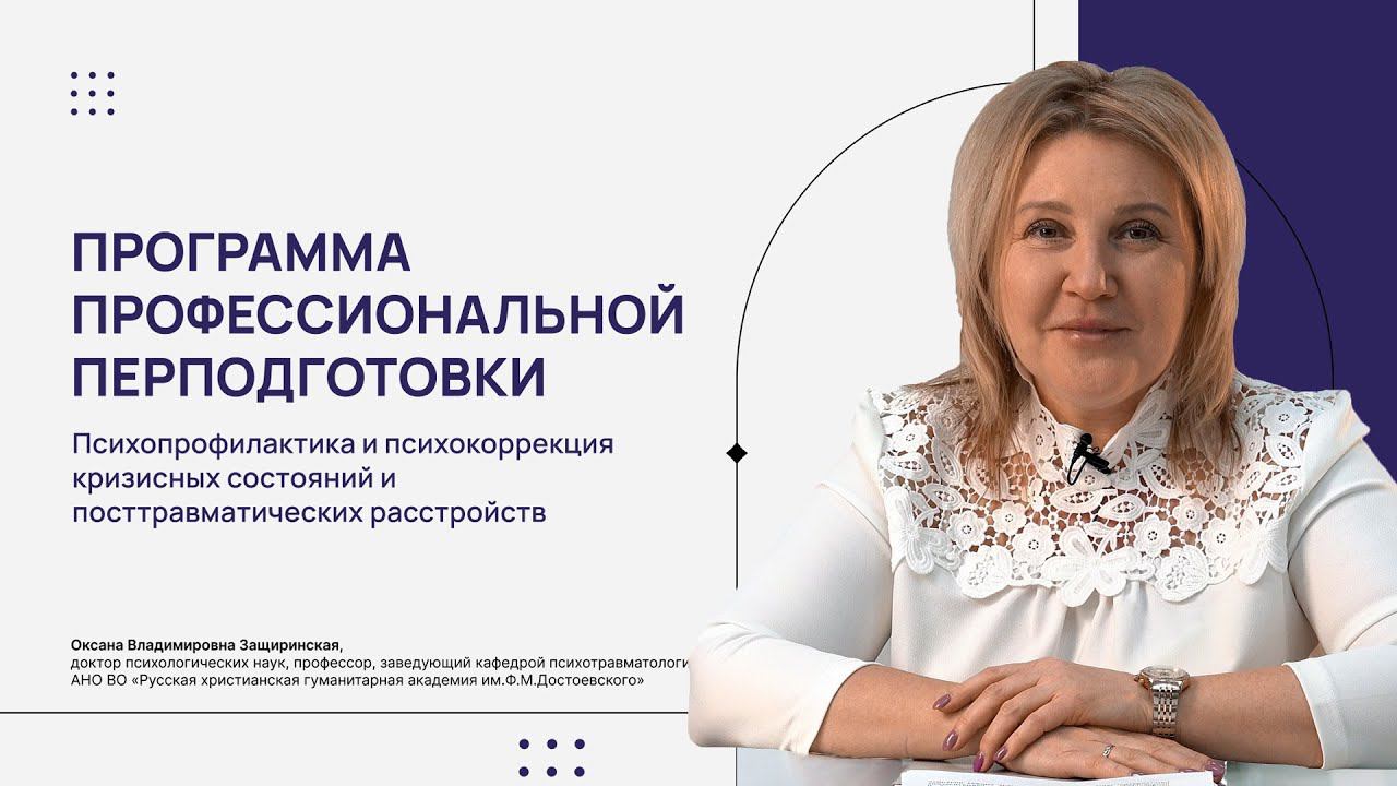 Программа профессиональной переподготовки по психологии «Психопрофилактика и психокоррекция кризисных состояний и посттравматических расстройств» Программу представляет Оксана Владимировна Защиринская, доктор психологических наук, профессор, заведующий кафедрой психотравматологии АНО ВО «Русская христианская гуманитарная академия им. Ф. М. Достоевского» РХГА в сети: https://vk.com/rhgaru Официальный сайт http://www.rhga.ru