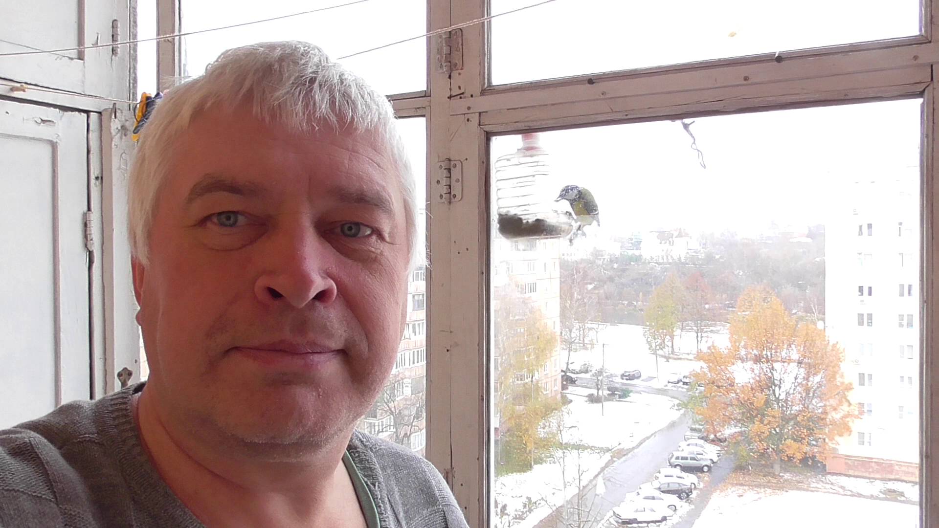 Я возле окна. За окном кормушка. Птицы синицы по очереди прилетают к кормушке