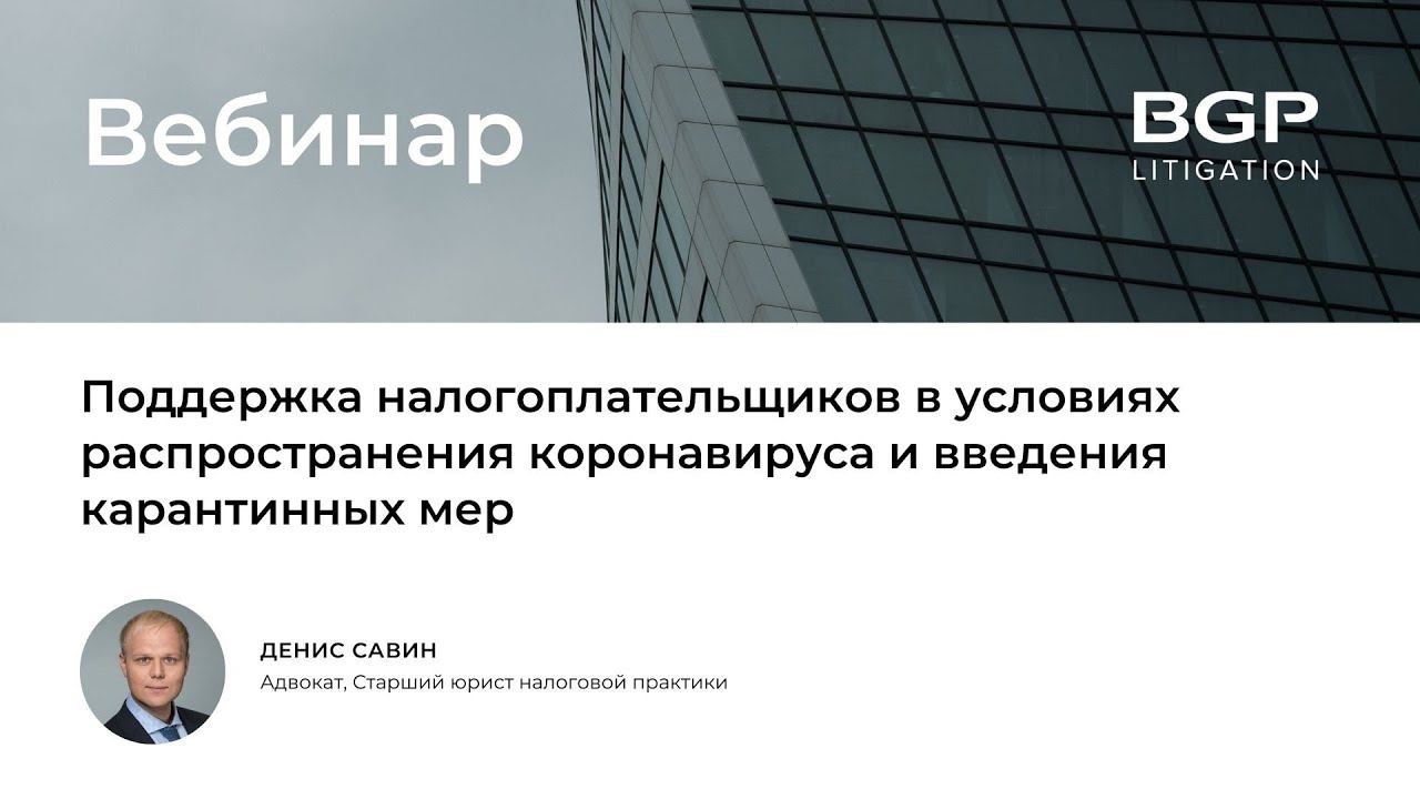 BGP Litigation совместно с Московской Торгово-Промышленной Палатой 1. Налоговые каникулы: - Кто получит отсрочку по налоговым платежам? - На какой срок и в отношении каких платежей предоставят отсрочку? - Как заявить о предоставлении отсрочки? 2. Можно ли сейчас включить свою компанию в реестр МСП и получить соответствующею поддержку? 3. Долговые каникулы: - С кого не будут взыскивать налоговые долги и как долго? - Нужно ли подавать документы и заявления в налоговую для приостановки взыскания? - Отзовут ли налоговики уже направленные меры взыскания? 4. Налоговые проверки и контрольные мероприятия: во время и после карантина. - Мораторий на назначение ВНП и их проведение: как долго продлится? - Как и на сколько можно продлить срок представления документов по требованию в связи со сложившейся ситуацией? - Возможно ли ликвидировать организацию без выездной проверки во время карантина? - Будут ли приостановлены проверки соблюдения валютного законодательства? 5. Как обжаловать действия налоговиков, если Вам незаконно отказано в мерах поддержки. Присоединяйтесь к BGP Litigation в социальных сетях: ▪️Facebook https://www.facebook.com/bgplitigation ▪️Telegram https://msto.me/card1620203889/ Связаться с нами: ▪️https://bgplaw.com ▪️office@bgplaw.com ▪️+7 (495) 777 28 20